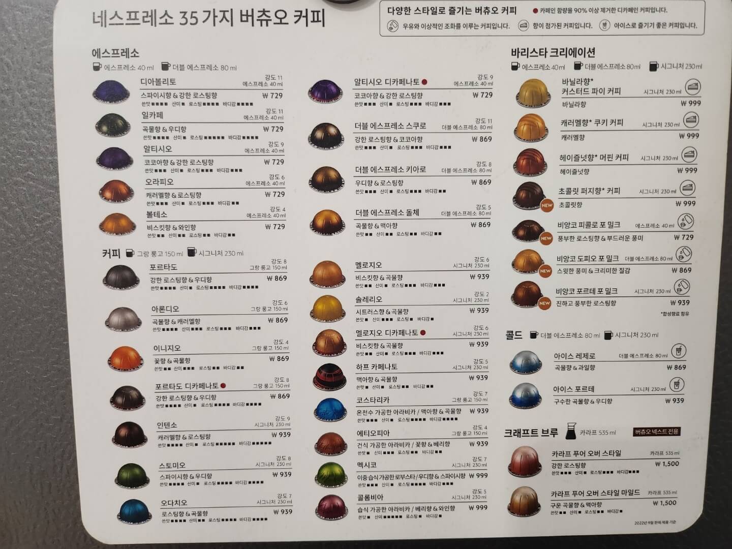 각 캡슐 별 강도와 용량, 산미와 로스팅, 바디감