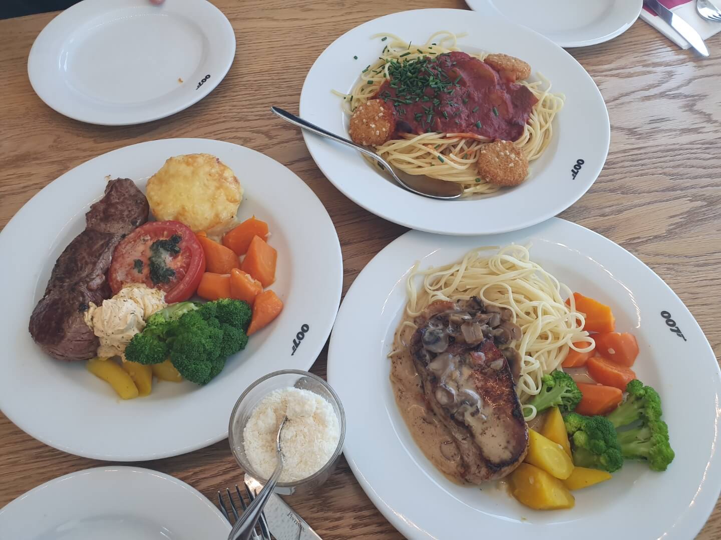 산 정상에서 먹는 음식은 색다르게 느껴졌고 절경이 따로 없었습니다. 스테이크는 맛있었고 스파게티는 평이했습니다.